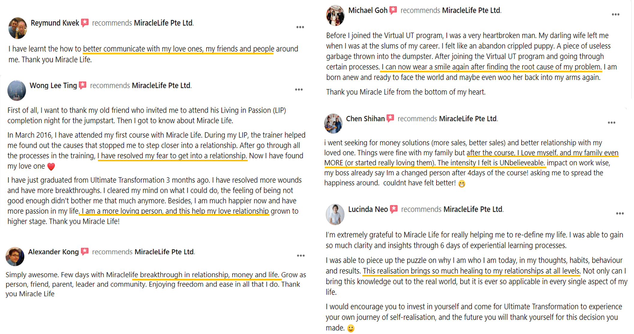 After MiracleLife's training, we start to love each other more as Father and son. I accept who he is. As for my wife, I've removed all the boundaries between me and her, and now I'm able to receive love from her and be able to love her more.